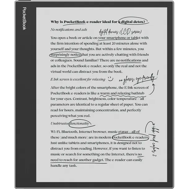 PocketBook InkPad Eo Mist Grey to doskonały wybór dla wszystkich miłośników e-czytania. Dzięki wysokiej jakości ekranowi, długotrwałej baterii i wszechstronnym funkcjom, takim jak SMARTlight i Text-to-Speech, jest idealnym towarzyszem każdej książkowej podróży. Jego elegancki design i lekka konstrukcja sprawiają, że jest wygodny do użytkowania zarówno w domu, jak i w podróży.
